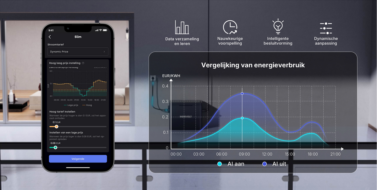 Met de Indevolt-app ontvang je real-time meldingen over elektriciteitsprijzen en kun je eenvoudig je oplaad- en ontlaadplannen beheren. Stel je doelprijs in, en het systeem laadt automatisch op bij lage prijzen en ontlaadt bij hoge prijzen. Bespaar geld en verdien extra inkomen!
