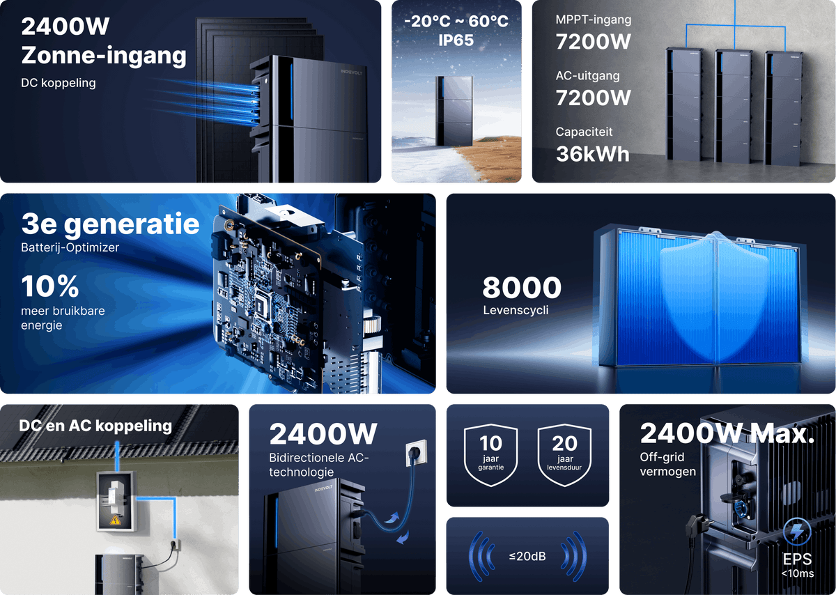- Max. 2400W in off-grid werking: Automatisch overschakelen binnen 10 ms om belangrijke apparaten soepel te laten werken bij stroomuitval.